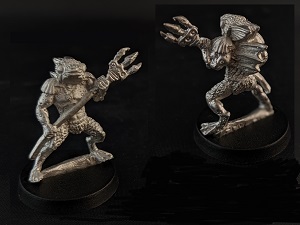 One lead-free pewter Sea Devil Champion Miniature. (Pictured from multiple angles.) Measures 30mm tall. Sculpted by: Simon Summers